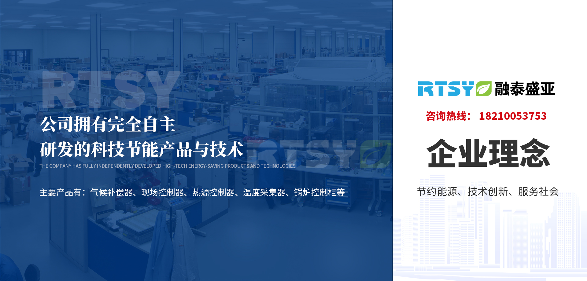 公司擁有完全自主研發的科技節能產品與技術。主要產品有:氣候補償器,現場控制器,熱源控制器,溫度采集器,鍋爐控制柜等。公司掌握的技術有:鍋爐控制和熱力系統優化技術、氣候補償控制技術、煙氣余熱回收技術、變頻控制技術、多熱源聯合供熱技術、水力平衡故障診斷技術、分時分溫控制技術、分布式變頻循環泵技術。